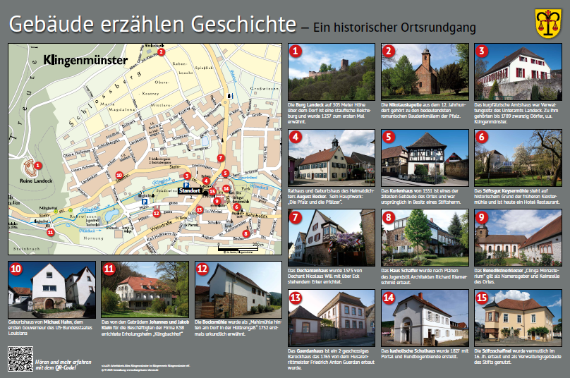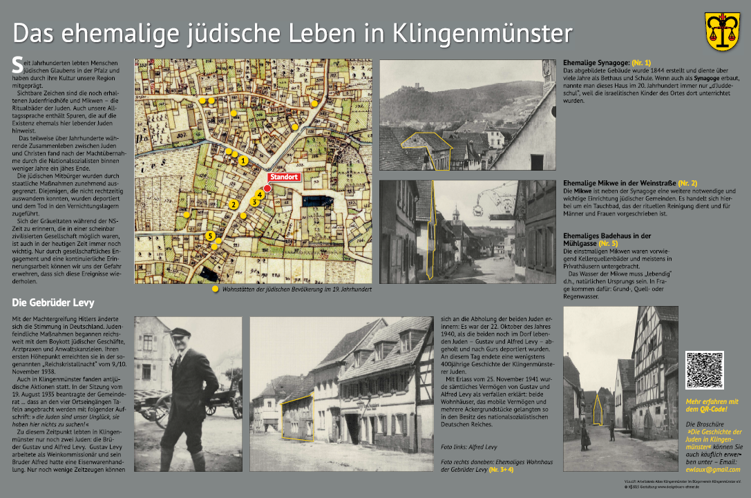 Im Haus Weinstraße 40 haben die Brüder Gustav und Alfred Levy gewohnt, sie waren die letzten jüdischen Mitbürger in Klingenmünster. Schon lange erinnert ein Stolperstein an die beiden Männer. Nun kann man mehr über ihr Schicksal erfahren, und zwar auf der Südseite der Informationstafel. Thematisiert wird auch die 400-jährige Geschichte der jüdischen Gemeinde in Klingenmünster. Eine Karte zeigt, wo sich zum Beispiel früher Synagoge und Mikwe befanden.
